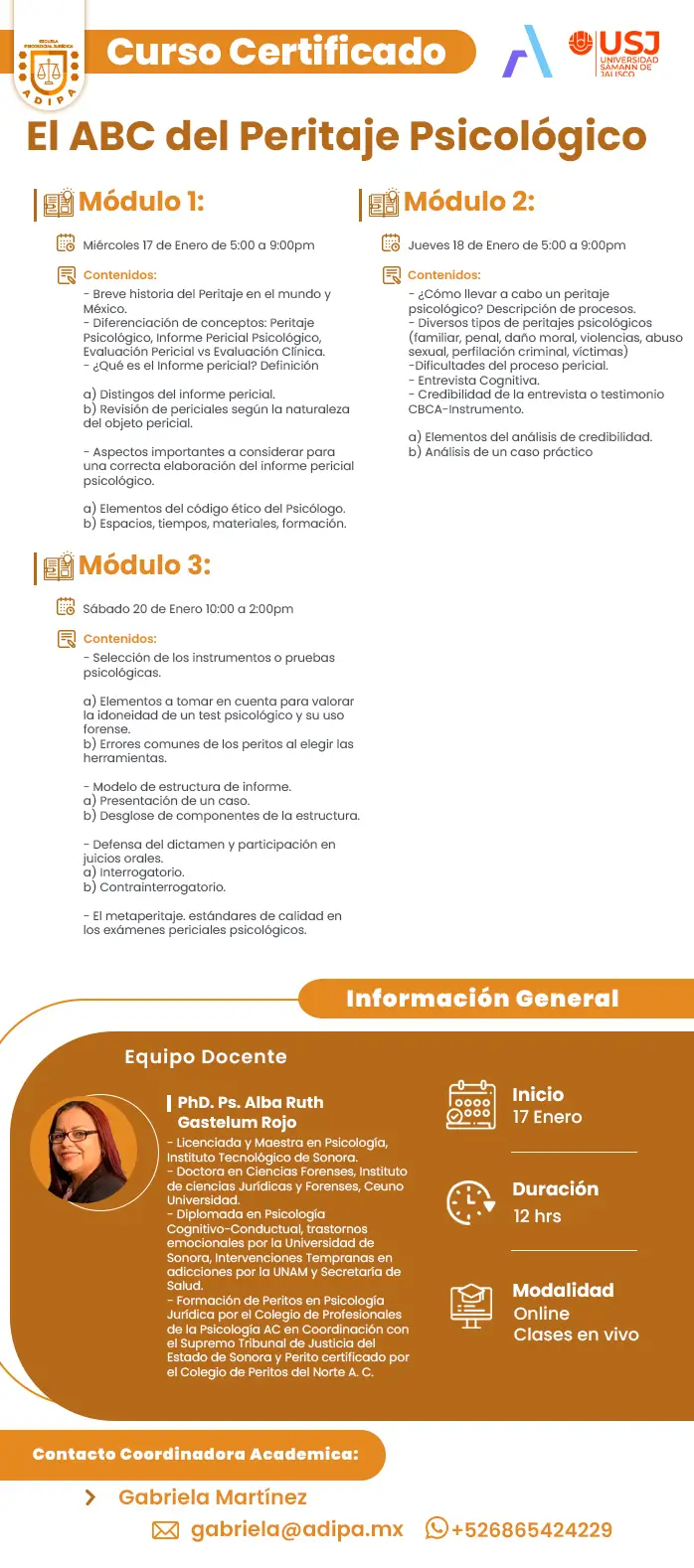 Este curso guiará al estudiante a través de todo el proceso y elementos fundamentales de la elaboración de un informe pericial psicológico, abarcando desde elementos tales como los distintos tipos de peritaje y sus diversos procesos, así como los errores que a menudo comenten los peritos y que deben evitar para generar un buen informe, hasta la defensa del dictamen y la participación en juicios orales.