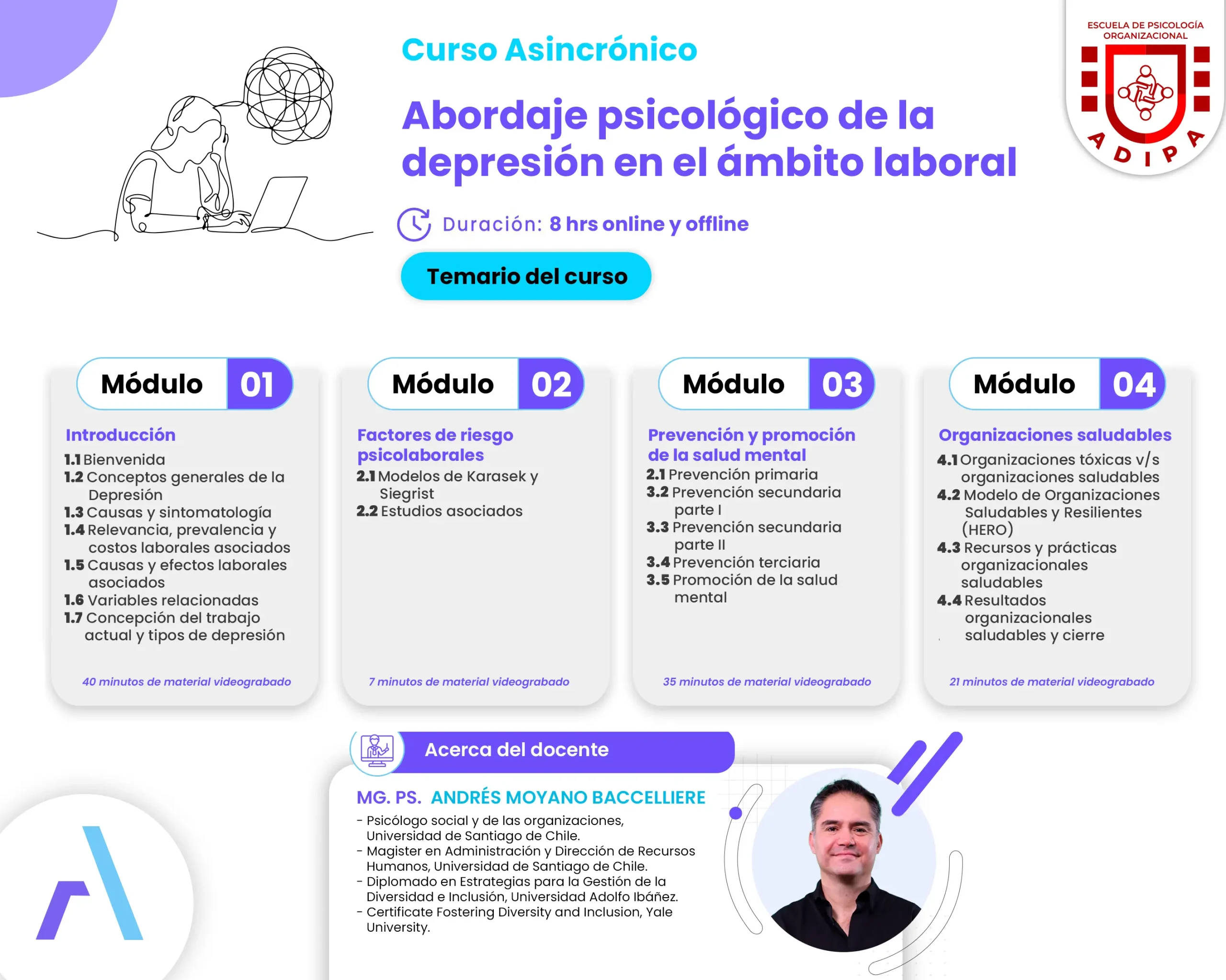 En este programa de estudio en modalidad asincrónica, comprenderás este fenómeno en profundidad, aterrizando su impacto en el contexto laboral con énfasis en estrategias de prevención y promoción en las organizaciones.