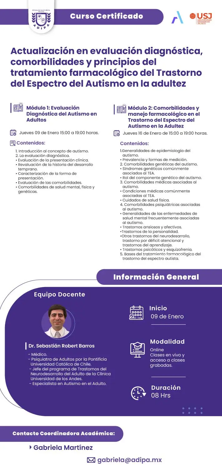 Sebastián Robert Barros es un psiquiatra chileno especializado en autismo en adultos. Egresado de la Pontificia Universidad Católica de Chile, actualmente es jefe del Programa de Trastornos del Neurodesarrollo del Adulto en la Clínica Universidad de los Andes. Su trabajo se enfoca en el diagnóstico y tratamiento del Trastorno del Espectro Autista (TEA) en la adultez, abordando tanto aspectos clínicos como comorbilidades asociadas. Además de su labor clínica, el Dr. Robert Barros participa activamente en la docencia y formación de profesionales a través de cursos y diplomados en ADIPA. Sus programas educativos incluyen actualizaciones en evaluación diagnóstica y principios de tratamiento farmacológico para el TEA en adultos. También lidera seminarios que desmitifican y brindan información sobre el autismo en la adultez. Su enfoque multidisciplinario y su compromiso con la educación y la práctica clínica han contribuido significativamente al conocimiento y manejo del autismo en la población adulta en Chile