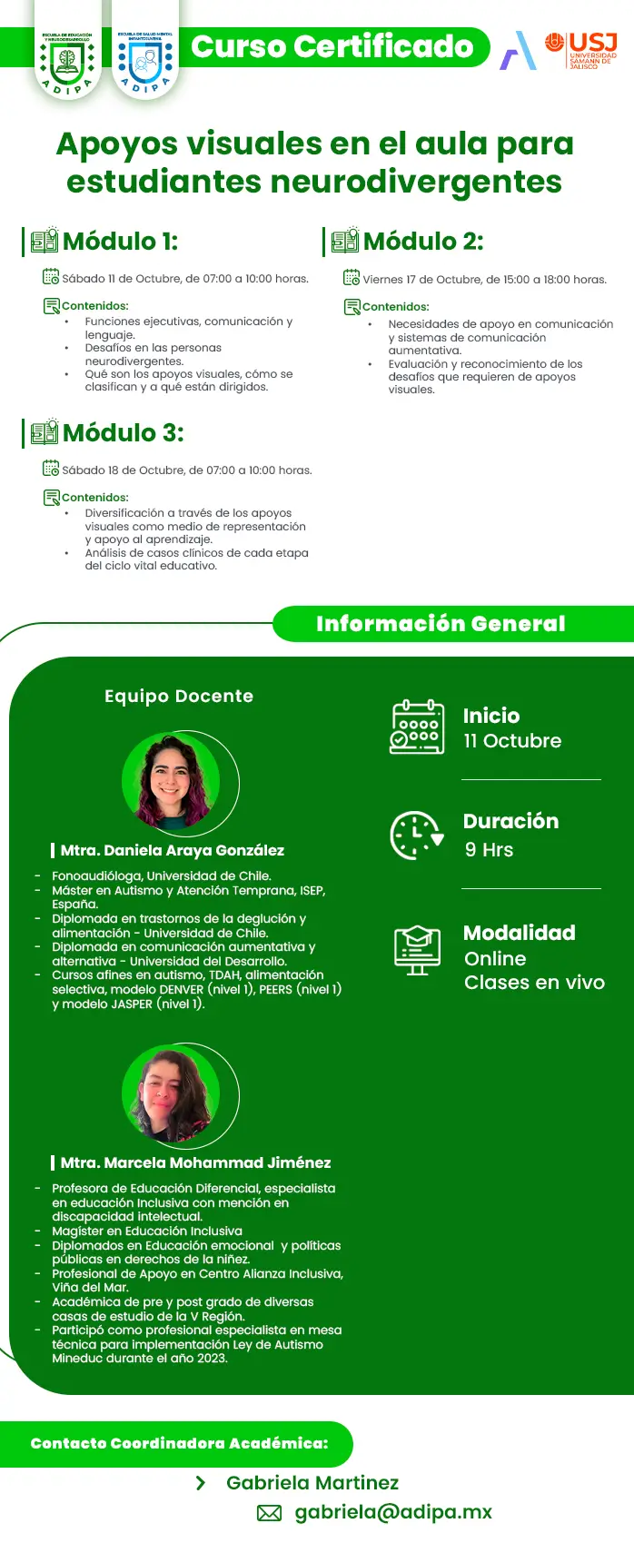 - Fonoaudióloga, Universidad de Chile. - Máster en Autismo y Atención Temprana, ISEP, España. - Diplomada en trastornos de la deglución y alimentación, Universidad de Chile. - Diplomada en comunicación aumentativa y alternativa, Universidad del Desarrollo. - Especialidad en autismo, atención temprana, comunicación aumentativa y alimentación responsiva. - Certificada en Greenspan Floortime (nivel 1) y en S.O.S Approach (Nivel 1) - Cursos afines en autismo, TDAH, alimentación selectiva, modelo DENVER (nivel 1), PEERS (nivel 1) y modelo JASPER (nivel 1).