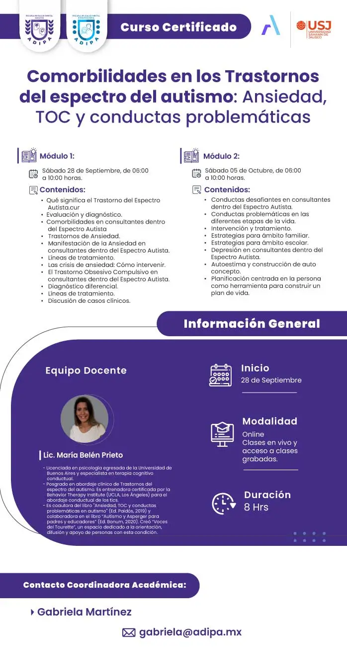 Licenciada en Psicología egresada de la Universidad de Buenos Aires y especialista en terapia cognitivo conductual. Tiene un posgrado en abordaje clínico de Trastornos del espectro del autismo. Es entrenadora certificada por la Behavior Therapy Institute (UCLA, Los Angeles) para el abordaje conductual de los tics. Es coautora del libro "Ansiedad, TOC y conductas problemáticas en autismo" (Ed. Paidós, 2019) y colaboradora en el libro “Autismo y Asperger para padres y educadores” (Ed. Bonum, 2020). Creó “Voces del Tourette”, un espacio dedicado a la orientación, difusión y apoyo de personas con esta condición. Es psicóloga colaboradora de ACOVASTTA (Asociación de la Comunitat Valenciana para el síndrome de tourette y trastornos asociados). Forma parte del equipo de Trastornos del espectro del autismo del Hospital Italiano de Buenos Aires y del equipo Ad Luminare. Es terapeuta del Centro Interdisciplinario de Tourette, TOC, Trastornos por déficit de atención y trastornos asociados (CITA). A su vez, coordina tratamientos en el equipo interdisciplinario Eureka y supervisa a profesionales dedicados a la terapia cognitivo conductual. Es docente de cursos de capacitación profesional a nivel nacional e internacional.