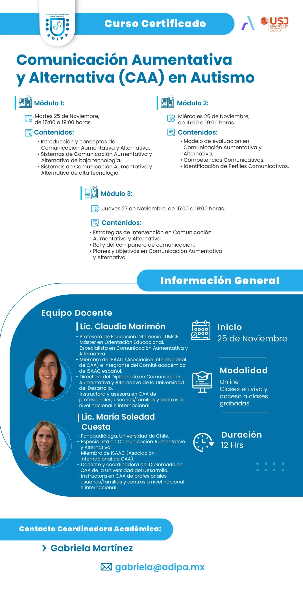 Esta actividad formativa teórico-práctica tiene como propósito actualizar conceptos y presentar a las nuevas tendencias y prácticas basadas en la evidencia en Comunicación Aumentativa y Alternativa. Se darán a conocer estrategias para implementar CAA, a partir del perfil comunicativo de los estudiantes y las diferentes opciones de sistemas de CAA disponibles.