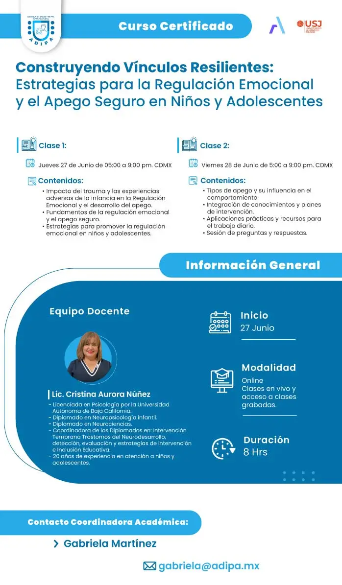 Este curso se centra en brindar estrategias efectivas a profesionales del área de la Salud Mental y Educacional para fomentar la regulación emocional y el desarrollo de un apego seguro en niños y adolescentes. A través de un enfoque teórico-práctico, los participantes explorarán diversas técnicas y herramientas destinadas a fortalecer la conexión emocional entre adultos y jóvenes, promoviendo así su bienestar emocional y social. Desde la comprensión de los fundamentos del apego hasta la aplicación de estrategias prácticas de intervención, este curso proporciona a los profesionales las habilidades necesarias para apoyar el desarrollo saludable de niños y adolescentes en contextos educativos, terapéuticos y familiares.