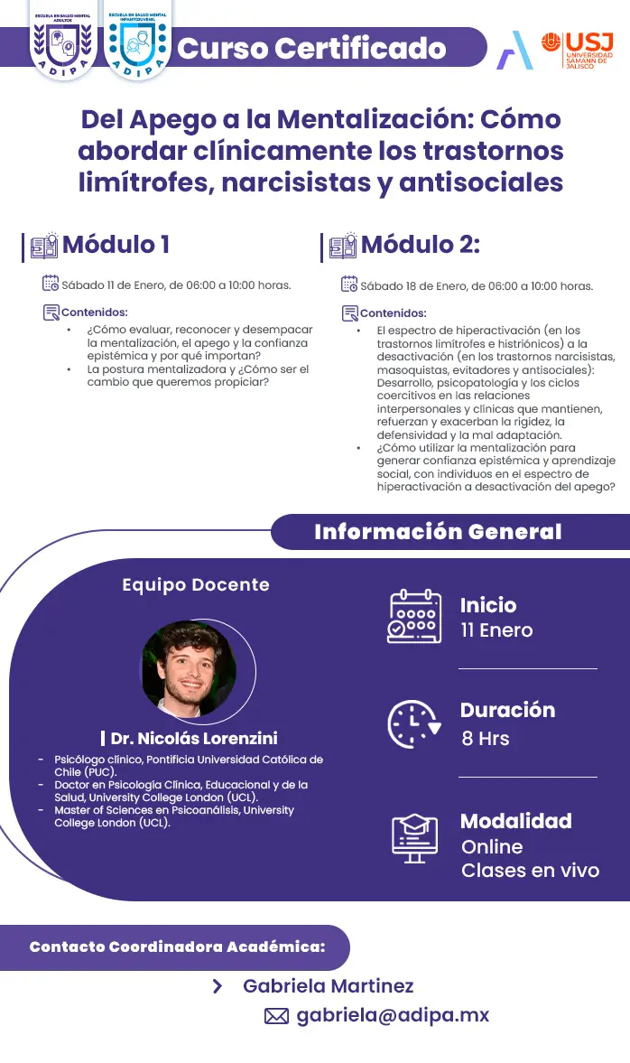 - Psicólogo Clínico, Pontificia Universidad Católica de Chile. - Master of Sciences en Psicoanálisis, University College London. - Doctor en Psicología Clínica, Educacional y de la Salud, University College London. - Diplomado en Intervenciones Psicoanalíticas en Salud, Pontificia Universidad Católica de Chile. - Investigador de la Unidad de Psicoanálisis, University College London. - Asistente del Profesor Peter Fonagy. - Ex-investigador asistente del Anna Freud Centre. Londres. - Docente de la International Psychoanalytic University Berlin. Alemania. - Vicepresidente de la Asociación para el Estudio y Desarrollo de la Mentalización (AIEDEM), España y Latinoamérica. - Miembro del Comité Editor de la Revista Mentalización, Psicoanálisis y Psicoterapia. - Miembro del Comité Ejecutivo de la International Attachment Network. Reino Unido. - Autor de diversos artículos científicos y capítulos en psicología.