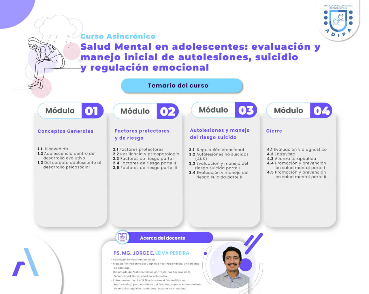 En este curso online asincrónico, podrás descubrir técnicas de diagnóstico y manejo de crisis, posibilitando un trabajo colaborativo junto a la familia, para así proporcionar un enfoque integral en la atención de la salud mental de los adolescentes.