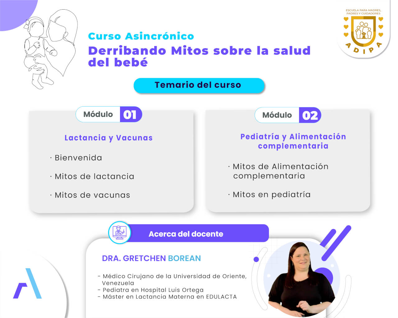 Estudia junto a la Médica Pediatra, asesora de lactancia, y madre, Gretchen Borean. En este curso, abordaremos los mitos más comunes sobre la lactancia, el sueño, la alimentación y el desarrollo de niños y niñas.