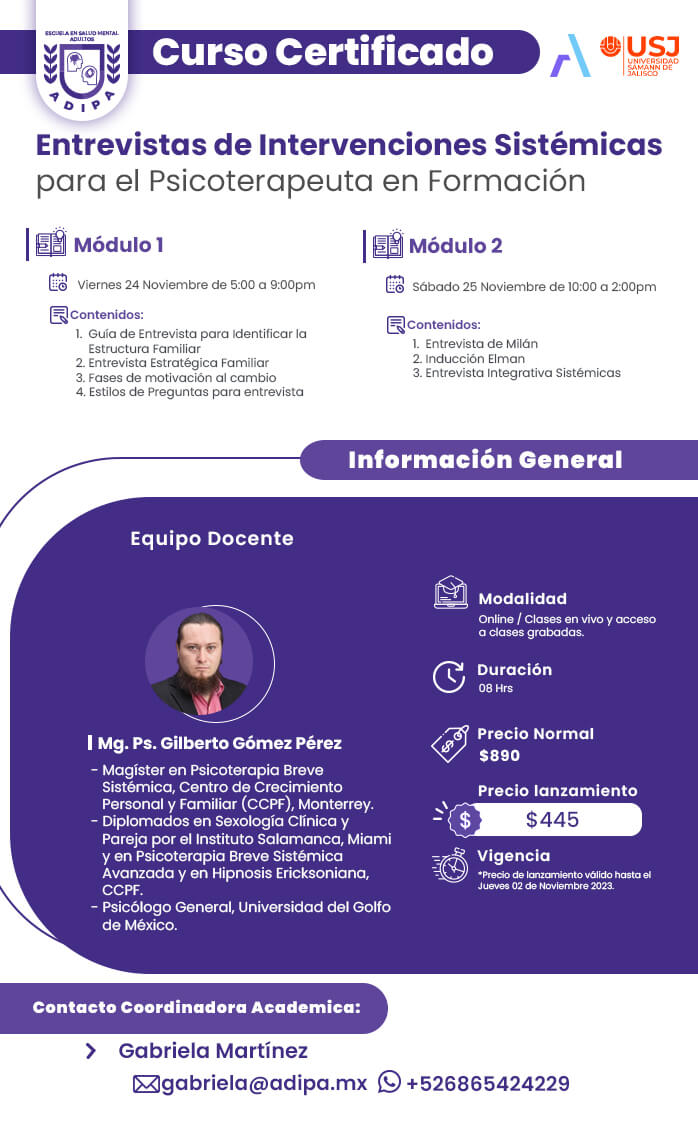 Al terminar el programa con una duración de 8 horas recibirás la Constancia con valor curricular del curso Entrevistas de Intervenciones Sistémicas para el Psicoterapeuta en Formación, acreditado por la Universidad Sämann de Jalisco.
