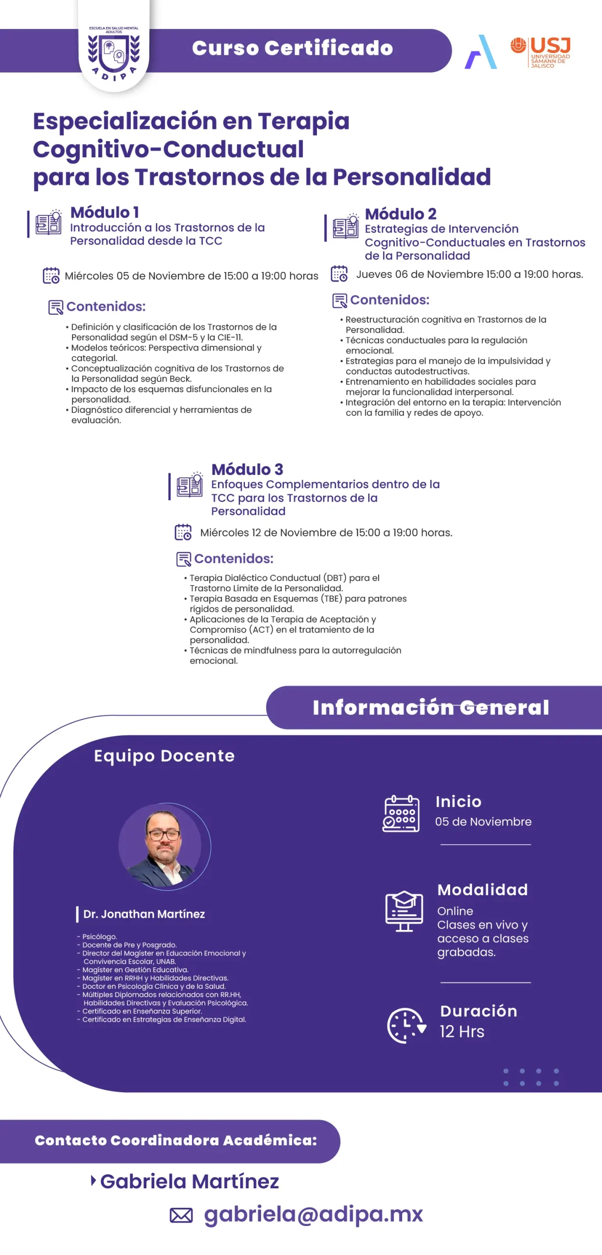 Este programa busca capacitar a profesionales de la salud mental en el uso avanzado de la TCC para la evaluación e intervención en Trastornos de la Personalidad. Se abordarán estrategias para la modificación de esquemas disfuncionales, la regulación emocional y el manejo de la impulsividad, integrando enfoques complementarios como la Terapia Dialéctico-Conductual (DBT), la Terapia de Aceptación y Compromiso (ACT) y la Terapia Basada en Esquemas. Además, se proporcionarán herramientas para el manejo de crisis y prevención del suicidio, promoviendo intervenciones eficaces que mejoren la funcionalidad y calidad de vida de los pacientes.