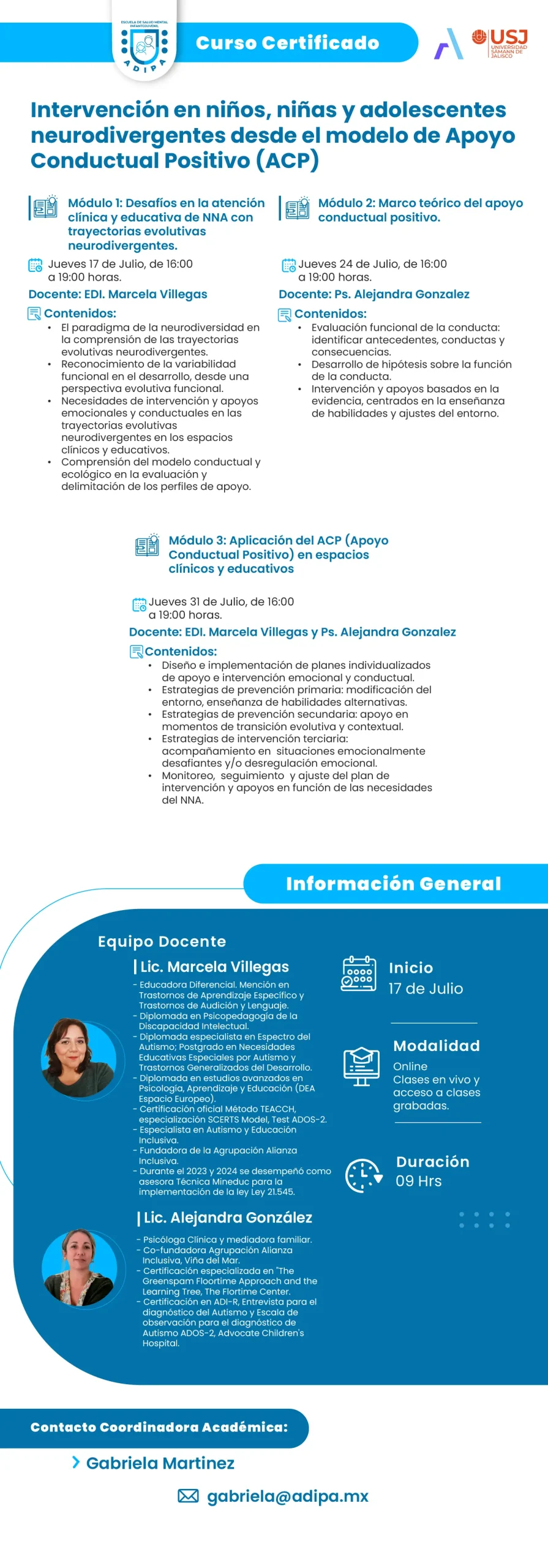 ⁃ Educadora Diferencial. Mención en Trastornos de Aprendizaje Específico y Trastornos de Audición y Lenguaje. ⁃ Diplomada en Psicopedagogía de la Discapacidad Intelectual. ⁃ Diplomada Especialista en Espectro del Autismo. - Postgrado en Necesidades Educativas Especiales por Autismo y Trastornos Generalizados del Desarrollo. ⁃ Diplomada en Estudios Avanzados en Psicología, Aprendizaje y Educación (DEA Espacio Europeo). ⁃ Certificación oficial Método TEACCH, especialización SCERTS Model, Test ADOS-2. - Académica en diversas casas de estudios, con más de veinte años de destacada trayectoria en educación inclusiva y apoyos para personas dentro del Espectro del Autismo y sus familias, liderando distintas iniciativas académicas, educativas y terapéuticas a nivel nacional e internacional. - Fundadora Agrupación Alianza Inclusiva de Viña del Mar. - Durante el 2023 y 2024 se desempeñó como impulsora y asesora técnica para la implementación de la Ley 21.545, Ministerio de Educación.