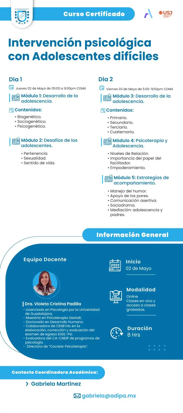 Licenciada en Psicología por la Universidad de Guadalajara - Maestría en Psicoterapia Gestalt •Doctorado en Desarrollo Humano - Docente universitario para la formación de psicólogos con una trayectoria de más de 20 años. - Colaboradora de CENEVAL en la elaboración, corrección y evaluación del examen de egreso EGEL-Psi. Evaluadora del CA-CNEIP de programas de psicología. - Directora de “Cocrear Psicoterapia”, espacio dedicado al trabajo personal a través de consulta individual, cursos y talleres, aportando a la salud mental y bienestar de los consultantes y participantes. - “Premio Estatal de Psicología Jalisco 2022 por una Cultura de Paz” Colegio Estatal de Psicólogos de intervención, Congreso del Estado de Jalisco, CEDHJ, CNEIP, SALME.