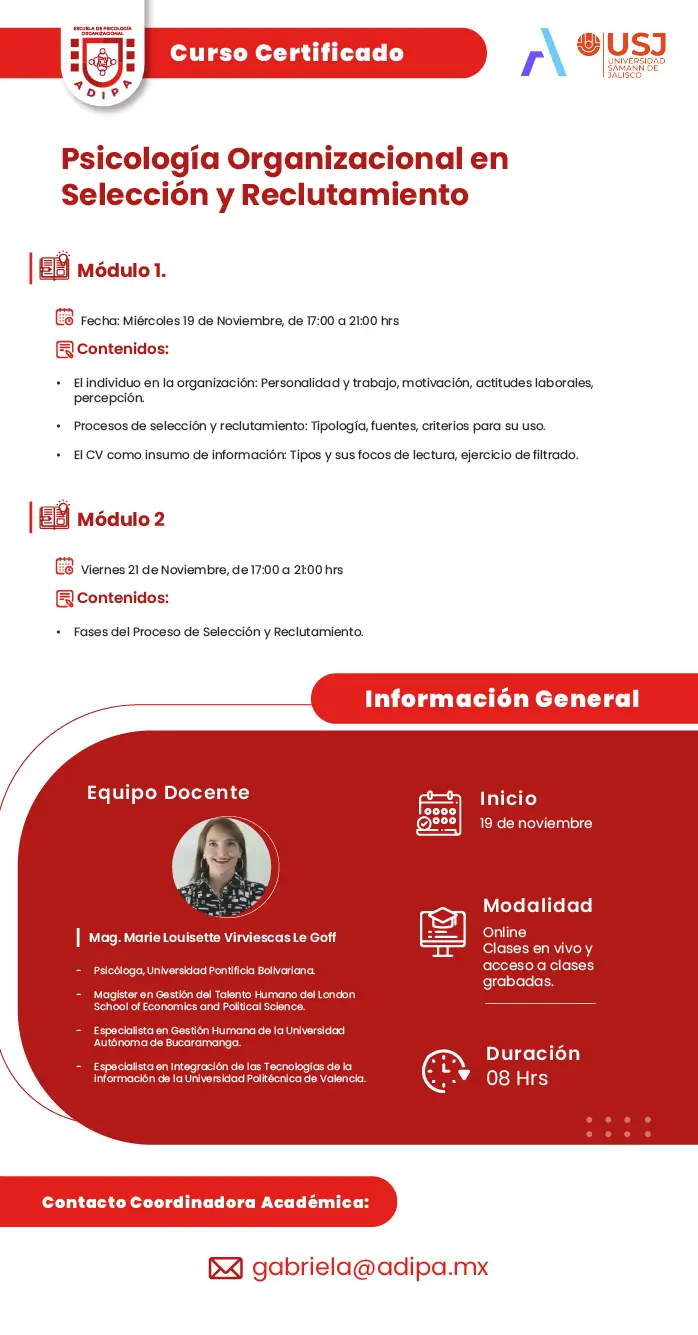 - Psicóloga de la Universidad Pontificia Bolivariana. - Especialista en Gestión Humana, Universidad Autónoma de Bucaramanga. - Especialista en Integración de las Tecnologías de la información, Universidad Politécnica de Valencia, España. - Magíster en Gestión del Talento Humano, London School of Economics and Political Science (LSE), Reino Unido. - Acreditada en metodología BELBIN UK para desarrollo de liderazgo generativo, trabajo en equipo y gestión del talento. - Más de 20 años de experiencia en selección y reclutamiento de personal. - Diseño de políticas para el equilibrio entre vida laboral y personal. - Experta en gestión por competencias y evaluación de desempeño. - Intervención para equipos de alto rendimiento. - Investigación cualitativa aplicada a entornos organizacionales multiculturales (Colombia, España, Reino Unido). - Docente de Pregrado y Posgrado en gestión humana, comportamiento organizacional y pruebas psicométricas en la Universidad Industrial de Santander y la Universidad Pontificia Bolivariana. - Consultora senior en la gestión del Talento Humano.
