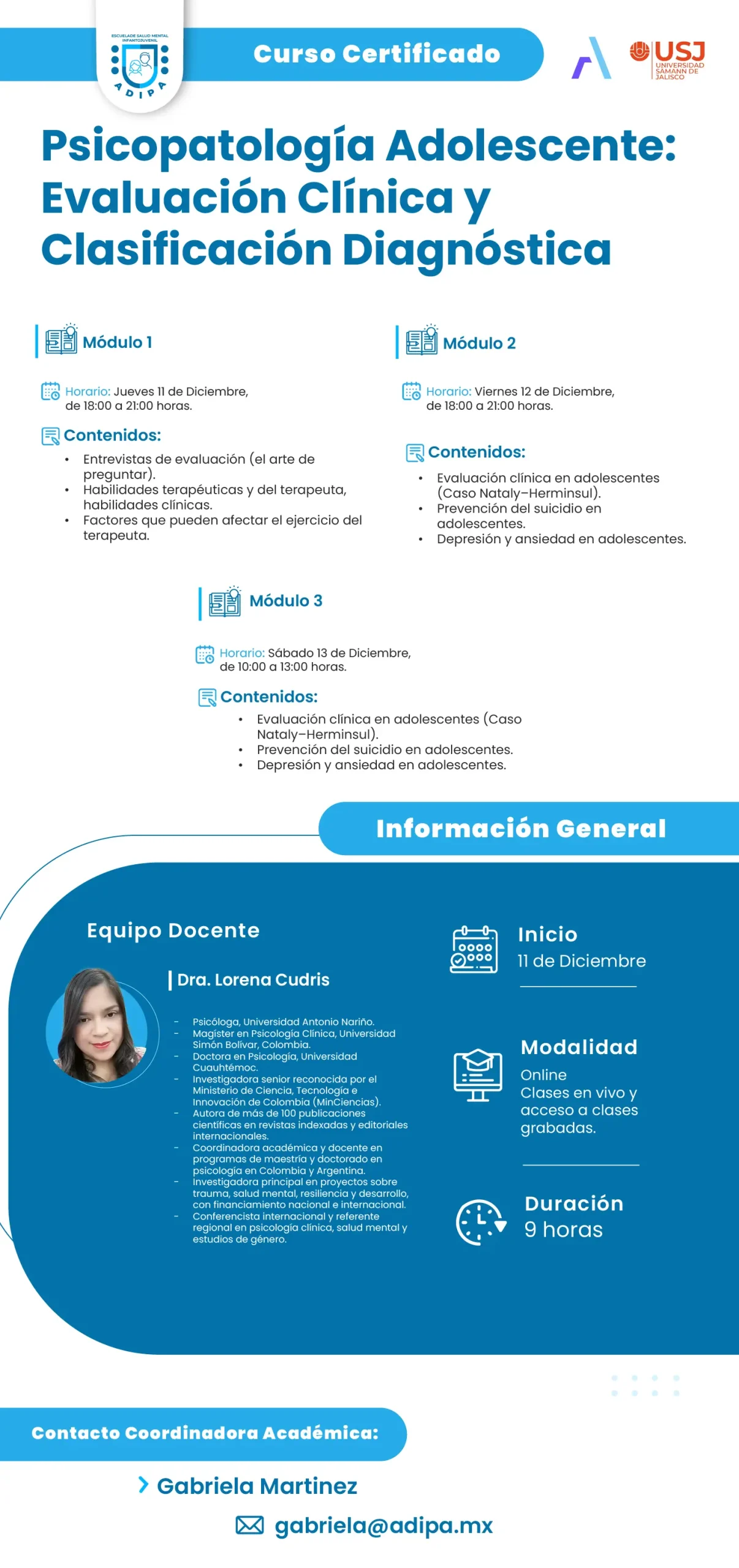 -Psicóloga, Universidad Antonio Nariño, Colombia. - Magíster en Psicología Clínica, Universidad Simón Bolívar, Colombia. - Doctora en Ciencias de la Educación, Universidad Cuauhtémoc, Plantel Aguascalientes México. Investigadora Senior reconocida por el Ministerio de Ciencia, Tecnología e Innovación de Colombia (MinCiencias). - Autora de más de 100 publicaciones científicas, incluyendo artículos en revistas indexadas, libros y capítulos de libros internacionales. - Miembro de comités editoriales y evaluadora científica para revistas académicas de alto impacto a nivel internacional. - Conferencista en eventos científicos internacionales en América Latina y Europa, en temas relacionados a los campos de la Psicología Clínica y Psicología Educativa. - Profesora Titular 3 y directora del Centro de Investigación en Salud, Bienestar y Autocuidado “Sabia” de la Universidad de la Costa. Es Vicepresidenta de la OWSD de la Unesco, capítulo Colombia. - Menciones honoríficas y premios a la excelencia en sus estudios de doctorado, maestría y pregrado. - Premio Nacional de Psicología a la Investigación Científica en Psicología 2024, Orden del Congreso de Colombia en el grado de caballero 2024. - Sus estudios han contribuido al logro del ODS 3 "Salud y bienestar". Su investigación se centra en el bienestar psicológico, salud mental y la calidad de vida de los estudiantes universitarios, especialmente en relación con el desempeño académico. - Reconocida nacional e internacionalmente por su contribución académica, promoviendo el desarrollo humano, científico y tecnológico en beneficio de la comunidad universitaria y la ciencia de la Psicología. - Participa en proyectos transnacionales como "Yo Puedo Sentirme Bien", que aborda la detección y tratamiento de ansiedad y depresión en universitarios de América Latina, y en "Experiencias cualitativas sobre los caminos que toman los universitarios hacia el cuidado de la salud mental", liderados por el Instituto Nacional de Psiquiatría Ramón de la Fuente Muñiz de México, en colaboración con la Universidad de Harvard y universidades de México y Colombia.