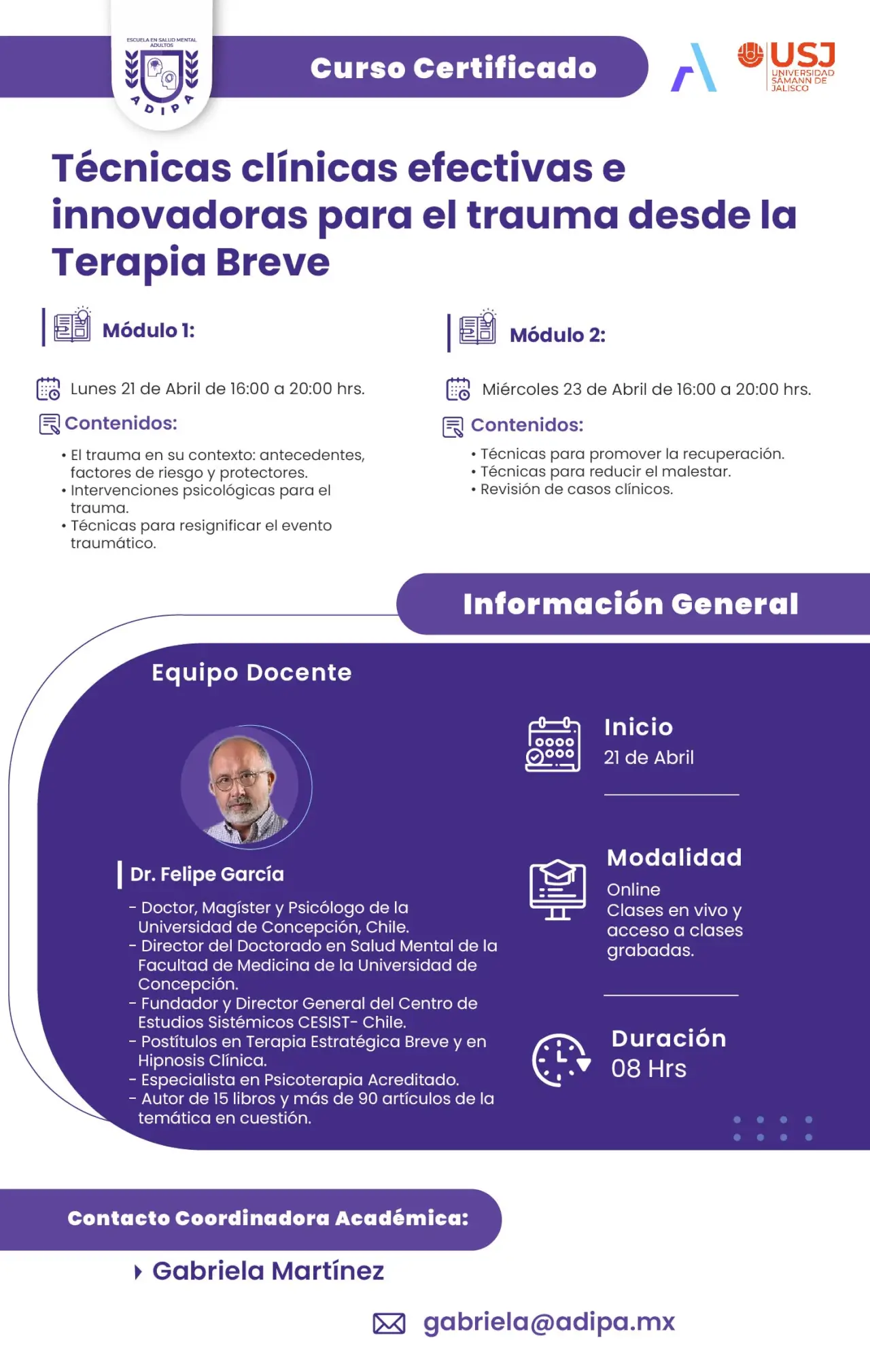 Al terminar el programa con una duración de 8 horas recibirás la Constancia con valor curricular del curso, Técnicas clínicas efectivas e innovadoras para el trauma desde la Terapia Breve, acreditado por la Universidad Sämann de Jalisco.