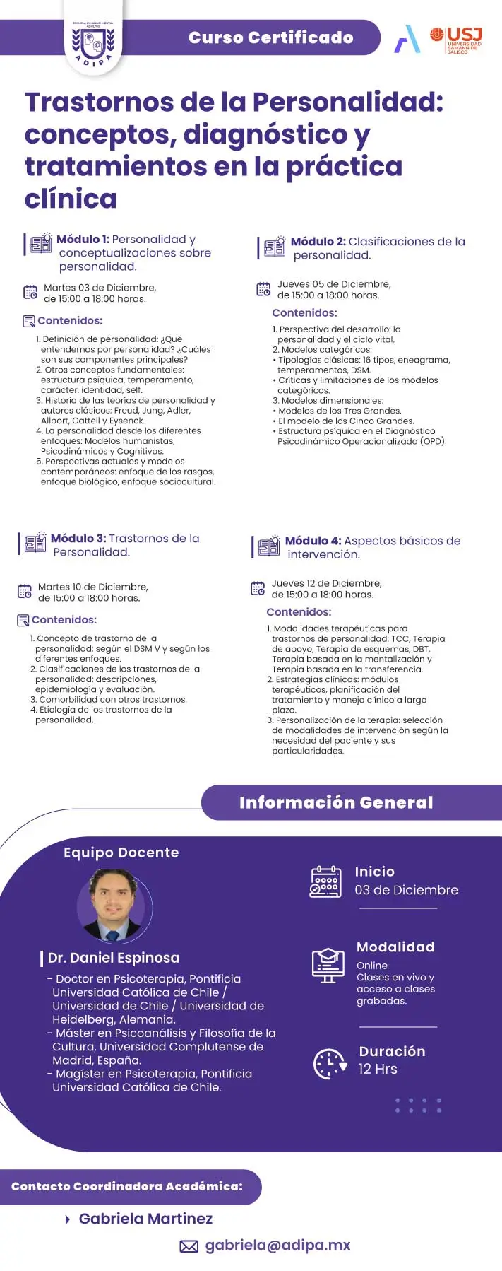 En este curso se expondrán conocimientos generales sobre personalidad, desde sus fundamentos teóricos hasta las perspectivas actuales, se explorarán las diversas formas en que la personalidad puede expresarse e influir en las relaciones interpersonales, la toma de decisiones, el bienestar personal y la vida cotidiana de las personas. Finalmente se abordará el tema de trastornos de la personalidad y las modalidades de intervención de las que hoy se dispone para su tratamiento.