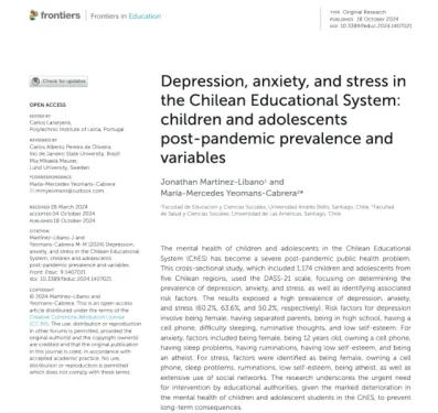 La salud mental de niños, niñas y adolescentes en el Sistema Educacional Chileno (SECh) se ha convertido en un problema de salud pública crítica tras la pandemia. Este estudio transversal, realizado en cinco regiones de Chile con una muestra de 1.174 estudiantes, evaluó la prevalencia de depresión, ansiedad y estrés, además de identificar factores de riesgo asociados.