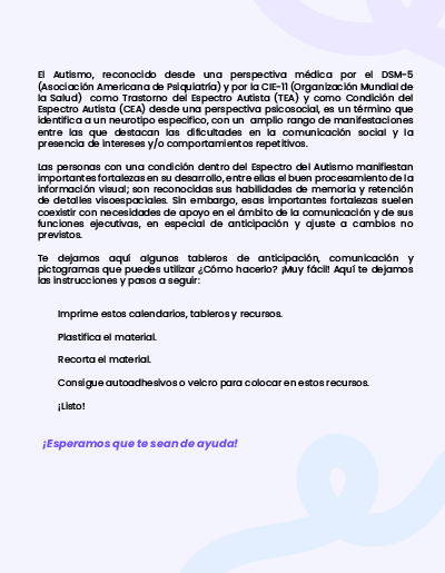 Facilita la comunicación y la adaptación de personas autistas con este compilado de tableros de anticipación, tableros de comunicación y pictogramas para descargar. Estos recursos visuales son esenciales para ayudar a niños, niñas, y adolescentes a fortalecer sus funciones ejecutivas, especialmente en la anticipación y el ajuste a cambios no previstos.