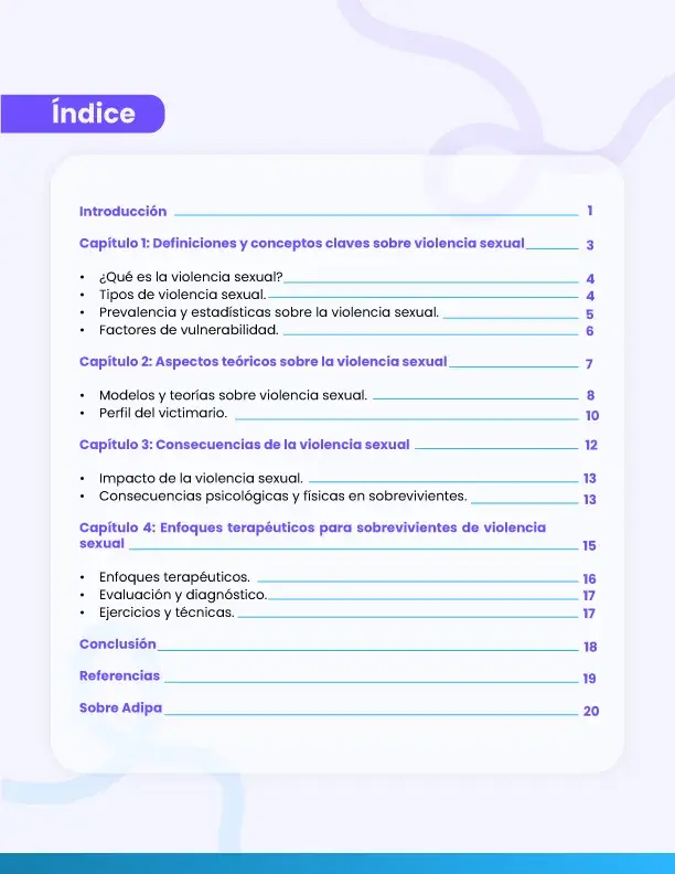 🤝 Comprender su naturaleza, las estadísticas actuales y los modelos teóricos es esencial para los profesionales de la salud mental que buscan ofrecer apoyo efectivo a las víctimas. Es por ello que en este ebook no solo te explicamos los diferentes aspectos de la violencia sexual, sino que también te entregamos herramientas prácticas y recomendaciones para la intervención y tratamiento de sobrevivientes a este tipo de delito.