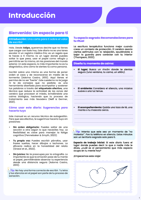 Este diario fue diseñado desde la psicología, con respaldo teórico y clínico, como un recurso flexible que facilita la expresión emocional y el trabajo reflexivo. Puede ser utilizado de forma personal o integrado como material complementario en procesos de acompañamiento psicológico, respetando siempre el ritmo y las necesidades de cada persona.