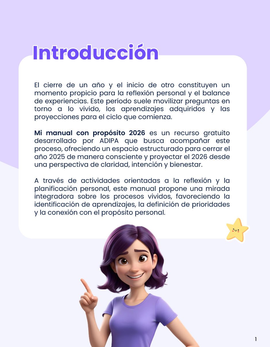 Desarrollado por ADIPA, este recurso combina ejercicios de reflexión, escritura y planificación práctica, con un enfoque respetuoso de los ritmos individuales. Descarga gratis este manual y acompaña tu año nuevo desde la intención y el autocuidado.