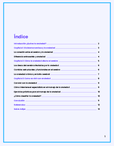 Descubre cómo la ansiedad impacta tu cerebro y aprende a manejarla de manera efectiva. Este Ebook ofrece información detallada sobre las características de la ansiedad, sus síntomas, y cómo difiere del estrés y otros trastornos. A través de explicaciones basadas en la neurociencia, este recurso te ayudará a entender los efectos de la ansiedad en el cerebro y te proporcionará estrategias prácticas para su manejo.