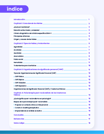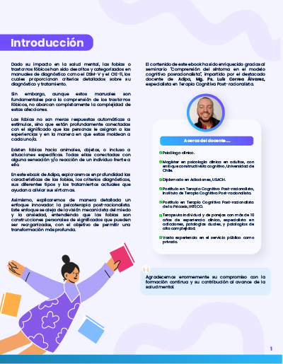 Este Ebook te ofrece una visión detallada y basada en evidencia sobre las fobias, sus síntomas, diagnóstico y los tratamientos más efectivos, abordándolas desde la mirada del modelo post racionalista.