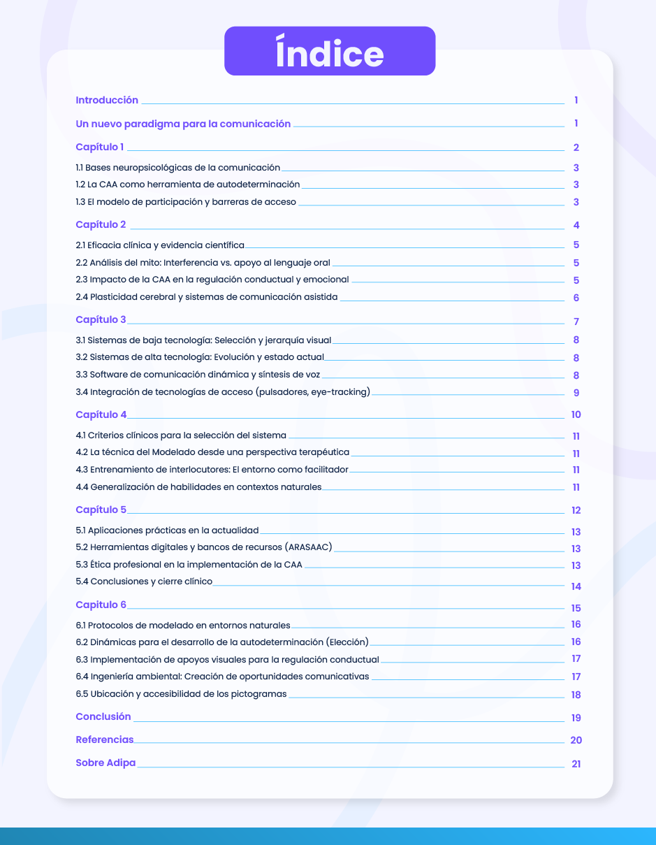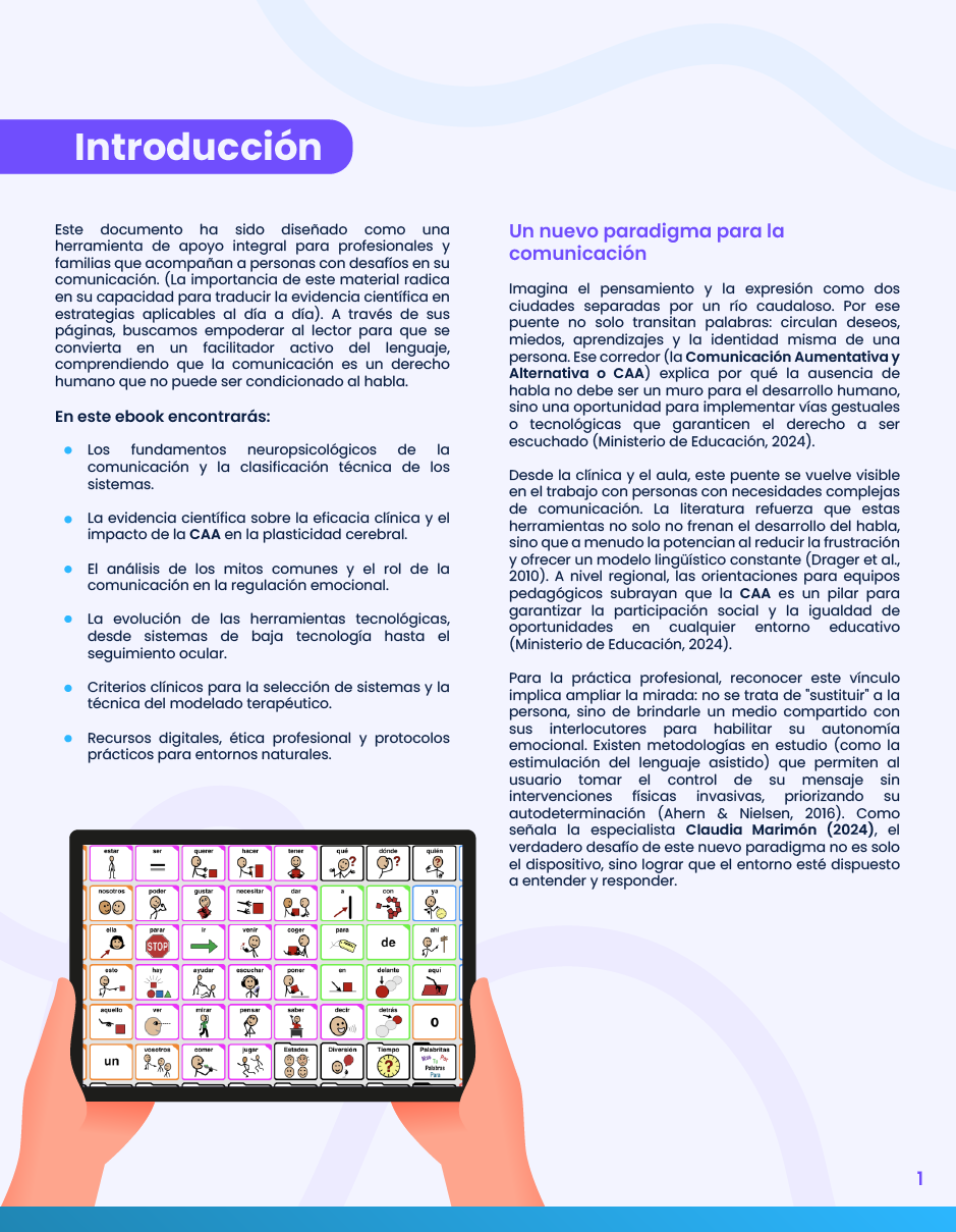 La comunicación aumentativa y alternativa (CAA) es un enfoque clave para garantizar el derecho a la comunicación de personas con necesidades complejas. Este ebook gratuito ofrece una mirada clínica, educativa y ética sobre los sistemas de CAA, integrando evidencia científica, fundamentos neuropsicológicos y estrategias prácticas aplicables en contextos reales. Un recurso pensado para profesionales y familias que buscan intervenciones efectivas y respetuosas.