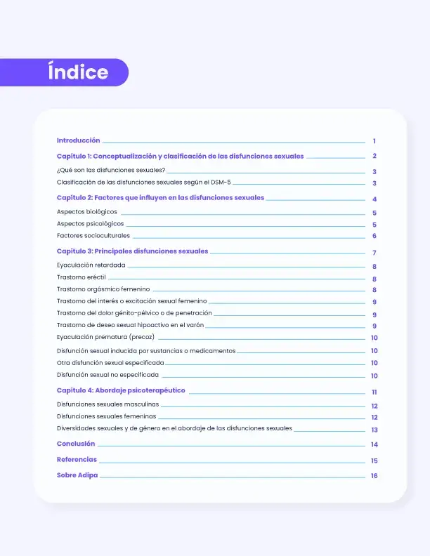 Descargar este material te permitirá comprender las principales disfunciones sexuales femeninas y masculinas, y conocer estrategias psicoterapéuticas eficaces para abordarlas en la práctica clínica. ¡Adquiere herramientas útiles y basadas en evidencia!