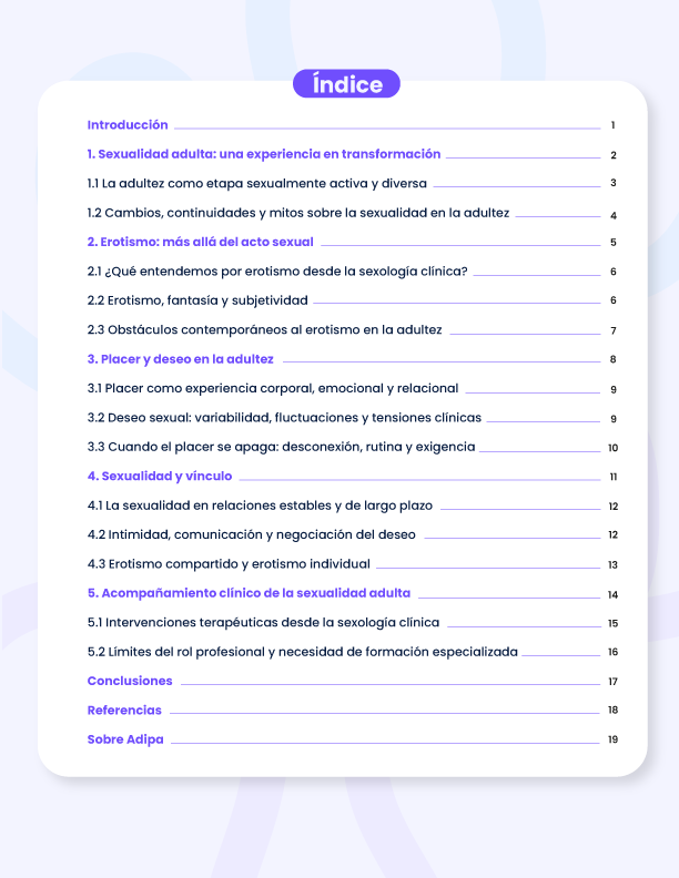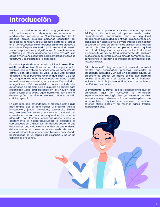 Dirigido a profesionales de la salud mental, el recurso ofrece un marco teórico y clínico para comprender la sexualidad adulta como una experiencia legítima de trabajo terapéutico, subrayando la importancia del encuadre ético, los límites del rol profesional y la necesidad de formación especializada.
