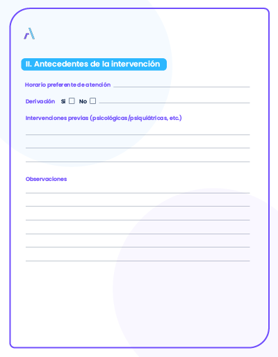 En ella, encontrarás distintas secciones que te permitirán organizar de forma escrita toda la información sobre tus procesos terapéuticos: desde los antecedentes personales de tus consultantes, hasta un detalle de cada sesión.