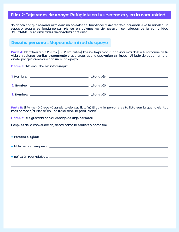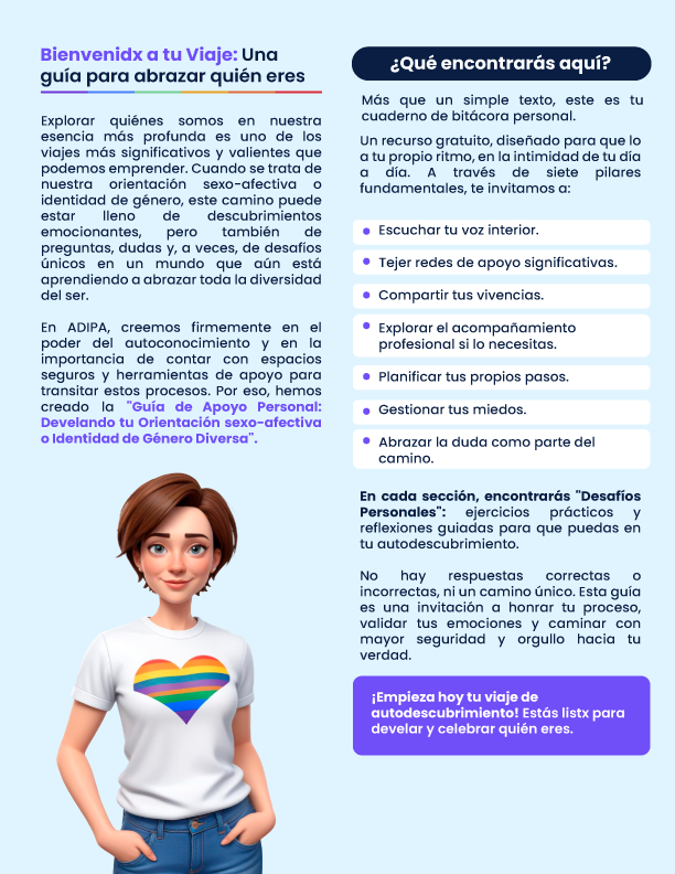 Este documento es un recurso psicoeducativo gratuito, desarrollado por ADIPA en colaboración con el psicólogo/e experto Mg. (c) Ps. Jaime Méndez Contreras, para garantizar una perspectiva informada, respetuosa y situada en las realidades de las diversidades LGBTIQANB+. Ha sido concebido como un cuaderno de trabajo personal y confidencial, un espacio seguro para ser utilizado al propio ritmo de cada individuo en su proceso de autodescubrimiento. Su estructura se basa en siete pilares fundamentales, cada uno acompañado de “Desafíos Personales”, que son ejercicios prácticos y reflexiones guiadas. El objetivo es ofrecer un marco de apoyo para que la persona pueda honrar su proceso, validar sus emociones y caminar con mayor seguridad y orgullo.