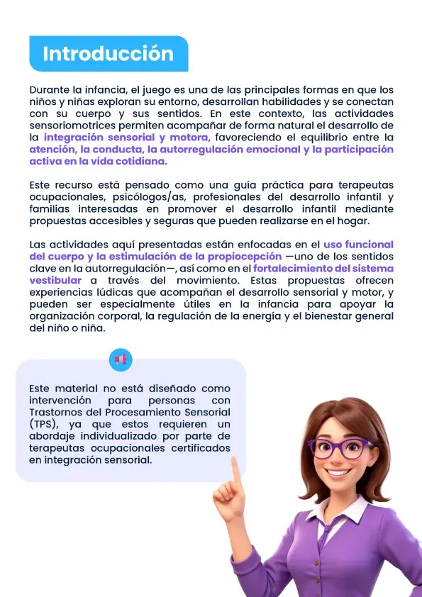 Este recurso práctico reúne una selección de actividades pensadas para acompañar el desarrollo sensorial y motor en la infancia, a través del juego, el movimiento y la exploración corporal, con materiales simples y adaptables.