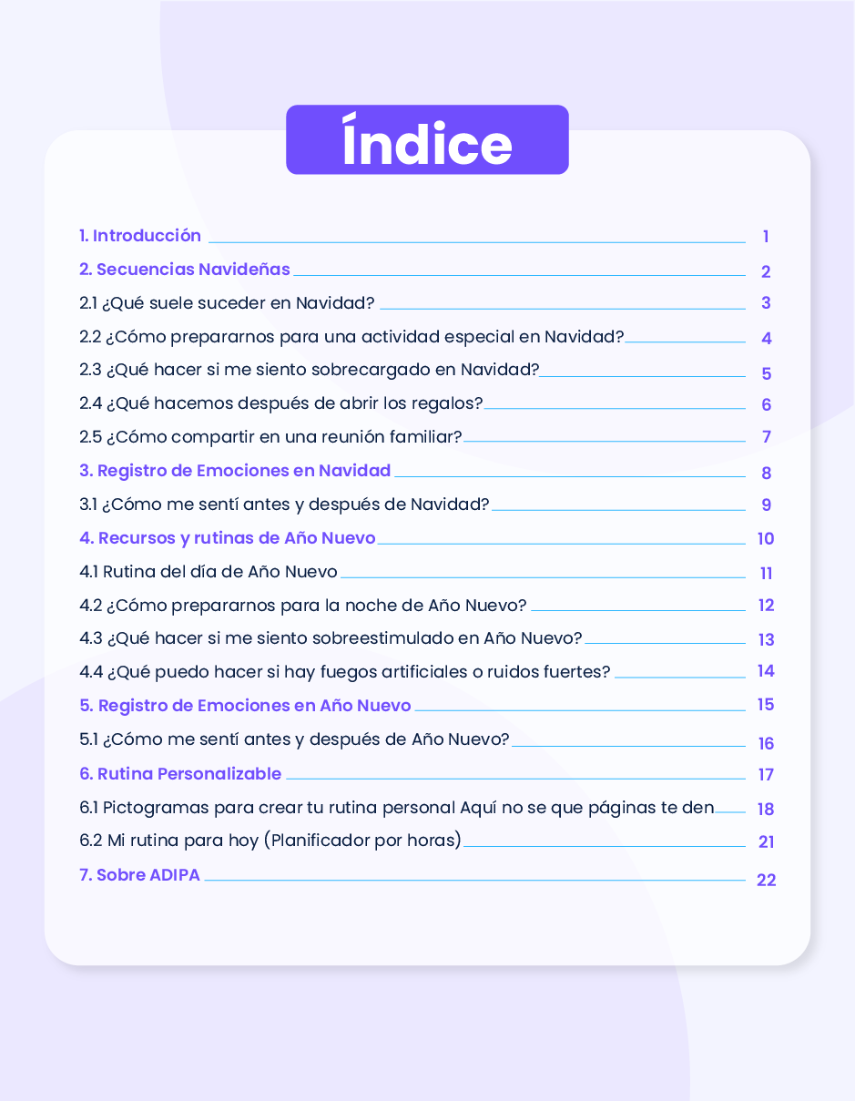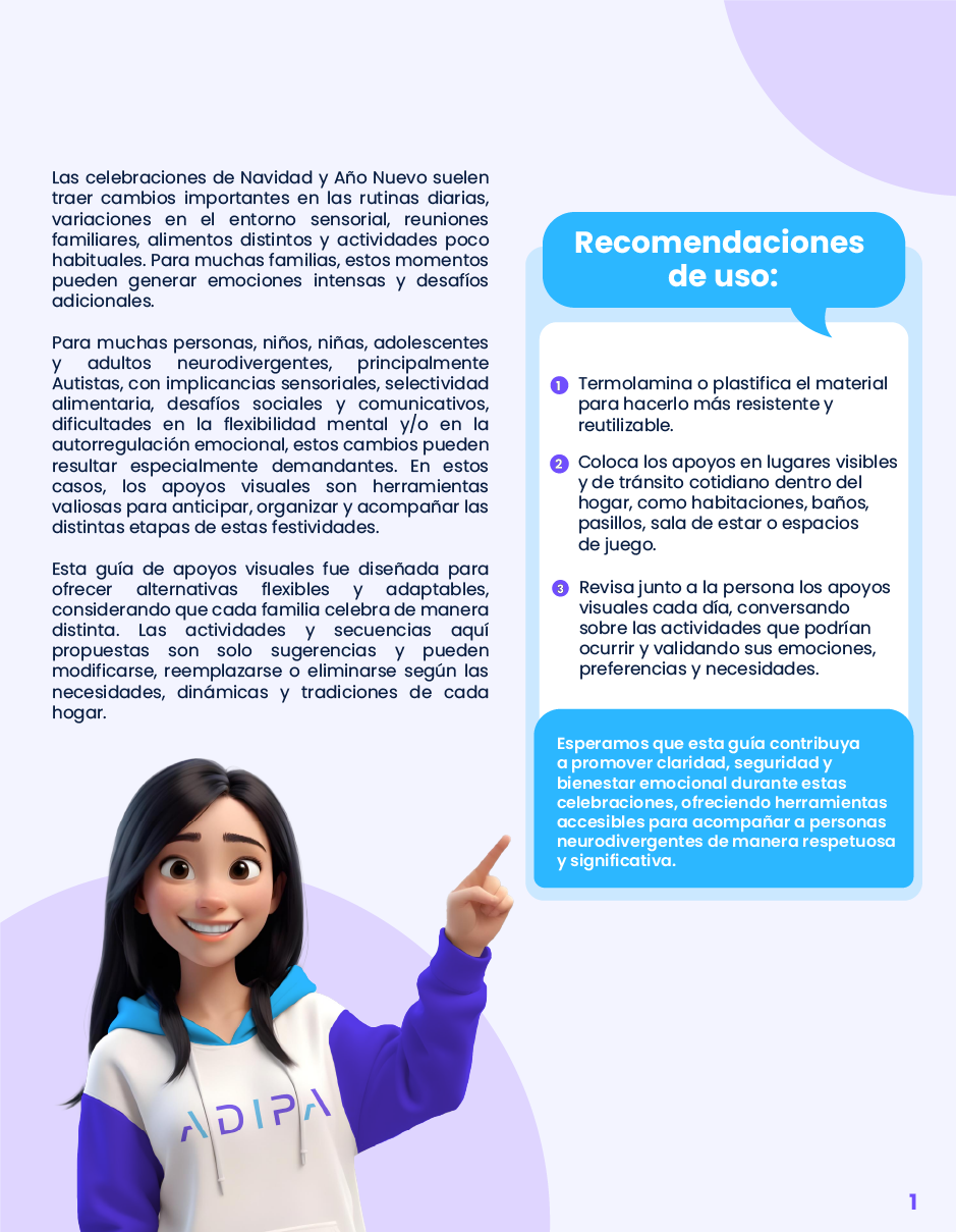 Las celebraciones pueden generar cambios, emociones intensas y desafíos sensoriales. Esta guía de apoyos visuales para Navidad y Año Nuevo ofrece herramientas claras, adaptables y respetuosas para anticipar rutinas, organizar actividades y promover bienestar emocional en personas neurodivergentes. Descarga gratis la guía completa aquí.