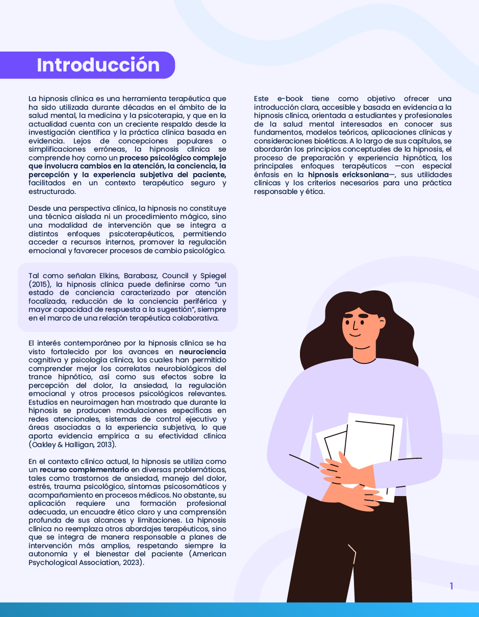 Este ebook está dirigido a estudiantes y profesionales de la psicología y la salud mental que buscan una introducción académica, actualizada y ética a la hipnosis clínica, con énfasis en su integración terapéutica y en el rol del profesional.