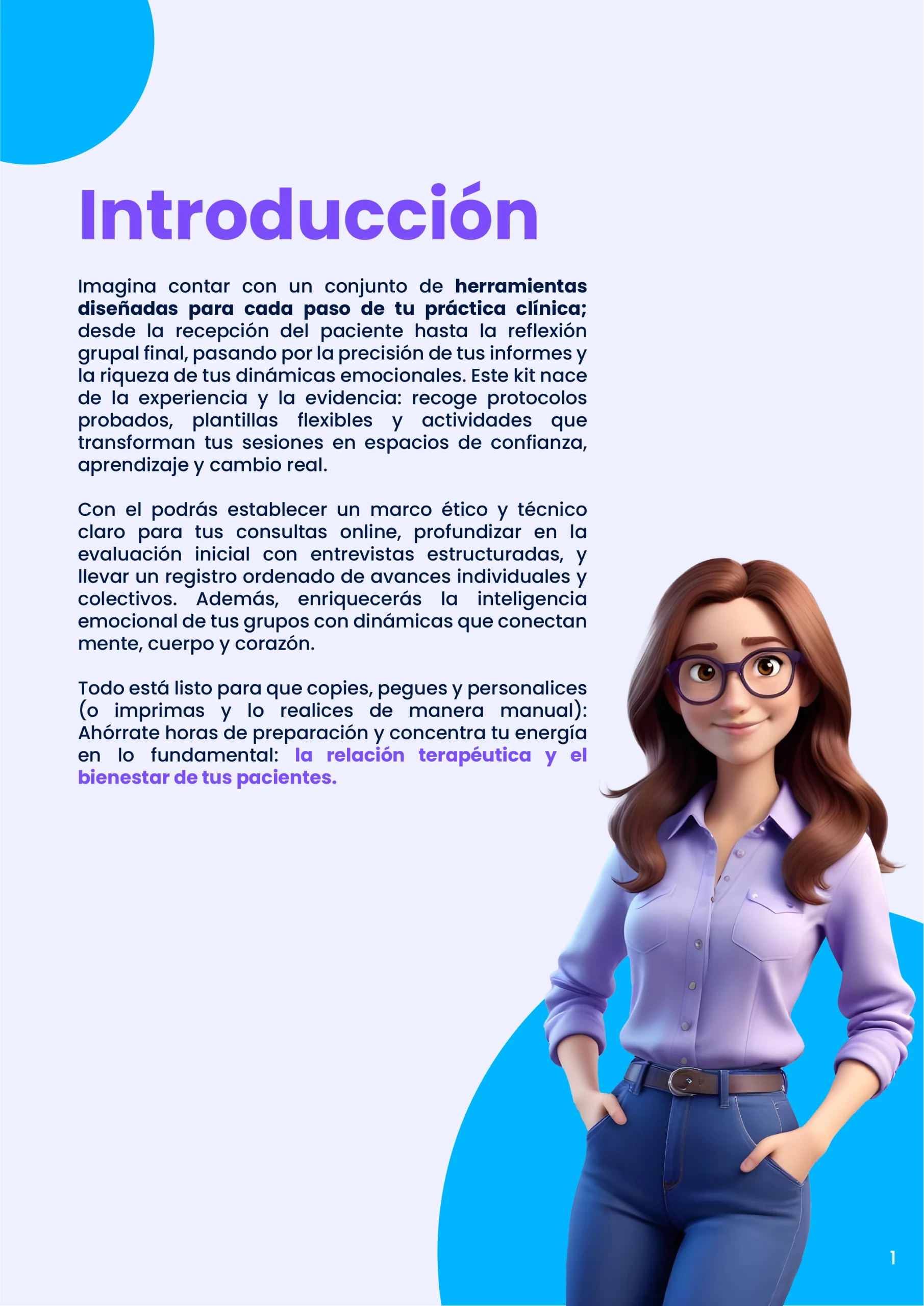 Este recurso responde a una necesidad concreta de la práctica clínica actual: contar con herramientas claras, estructuradas y adaptables que permitan sostener procesos terapéuticos de calidad, sin perder tiempo en tareas repetitivas o improvisadas. Está dirigido a psicólogas y psicólogos que trabajan en atención individual, grupal y en telepsicología, y que buscan fortalecer su encuadre profesional con respaldo técnico.