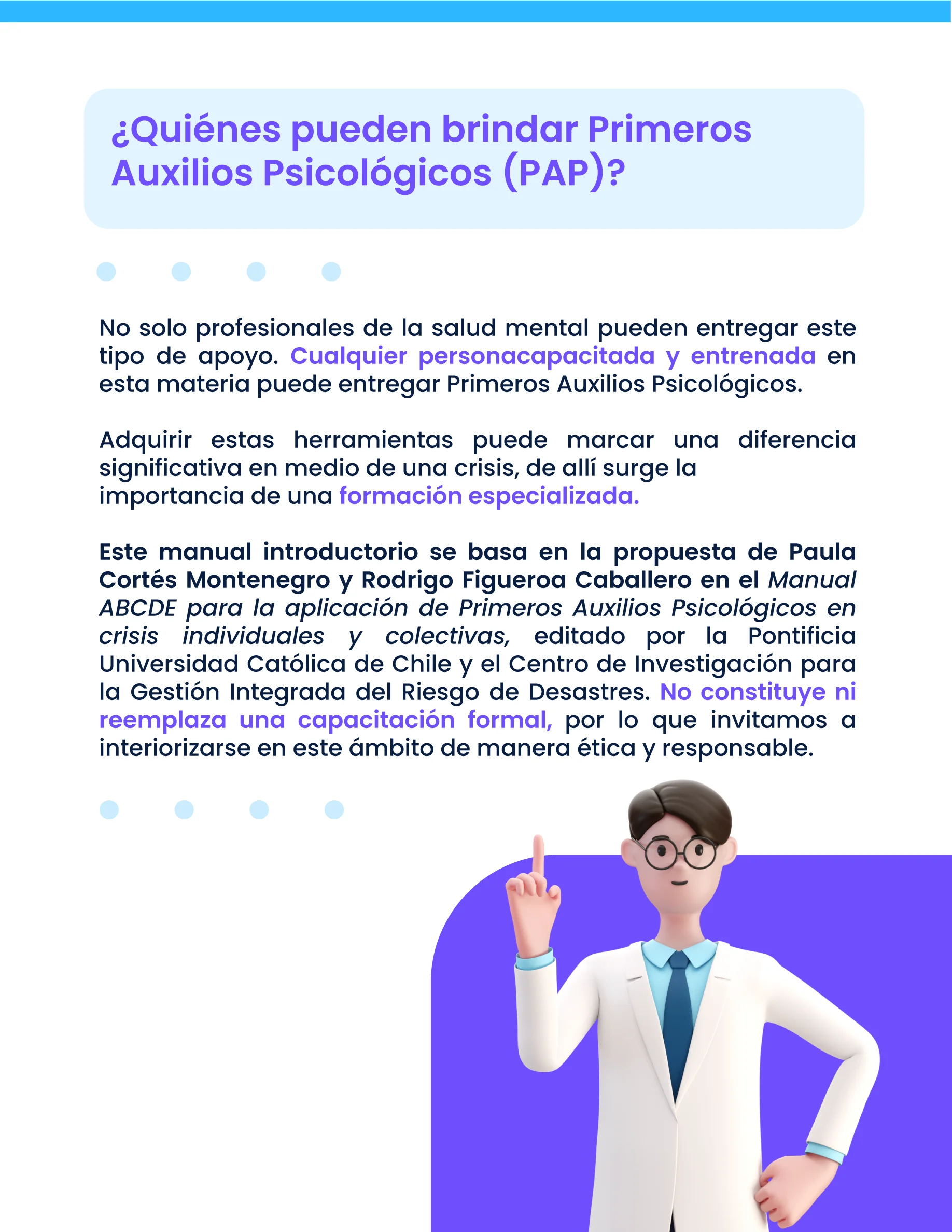 En este recurso aprenderás qué son los Primeros Auxilios Psicológicos como quienes pueden llevarlo a cabo. Asimismo, aprenderás sobre las distintas etapas de los Primeros Auxilios Psicológicos siguiendo el “protocolo ABCDE” como diversas estrategias y recomendaciones que debes llevar a cabo.