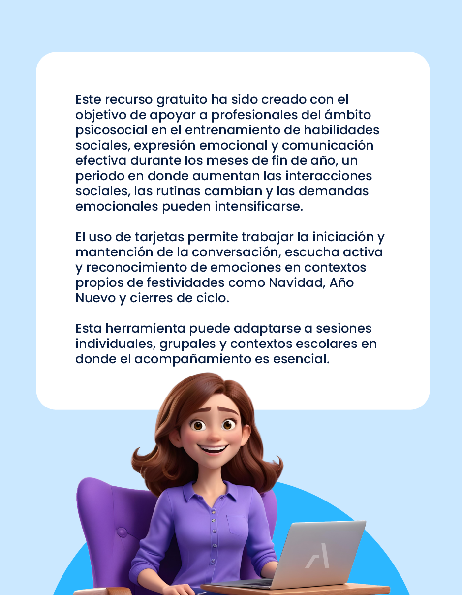 Estas tarjetas clínicas gratuitas están diseñadas para fortalecer habilidades sociales, promover la expresión emocional y facilitar conversaciones terapéuticas en contextos de fin de año. Descarga gratis este recurso listo para usar en tus sesiones.