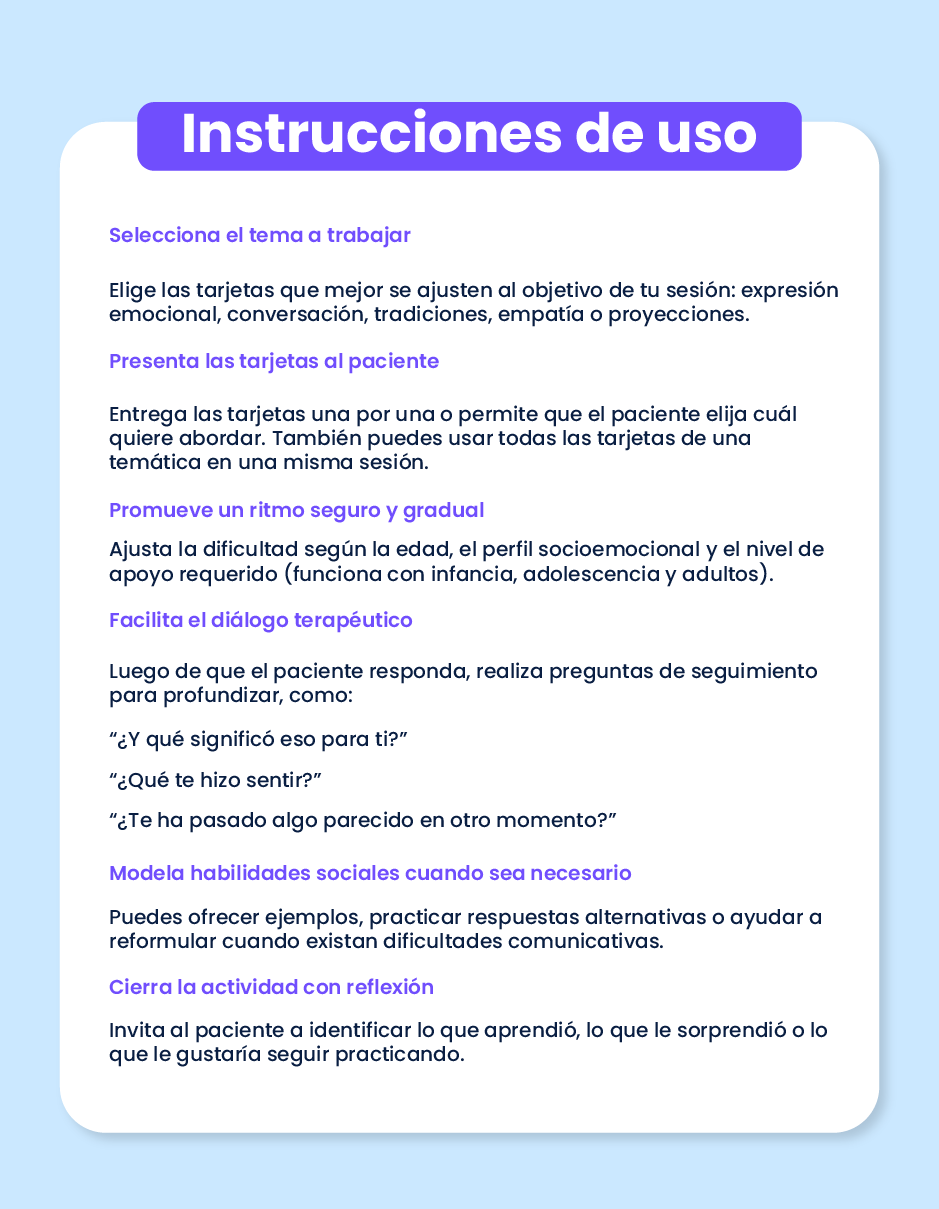 Este recurso está pensado para profesionales del ámbito psicosocial que buscan una herramienta práctica, adaptable y con enfoque terapéutico. Las tarjetas permiten trabajar conversación, reconocimiento emocional y empatía en diferentes edades y contextos. Su valor diferencial radica en su diseño temático, su aplicabilidad inmediata y su orientación clínica.