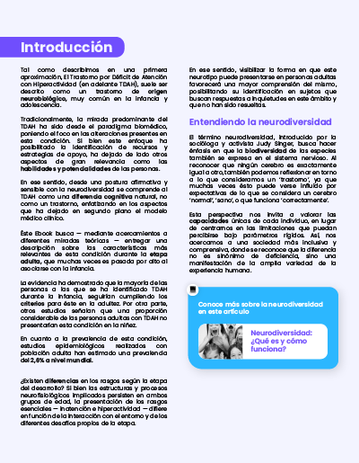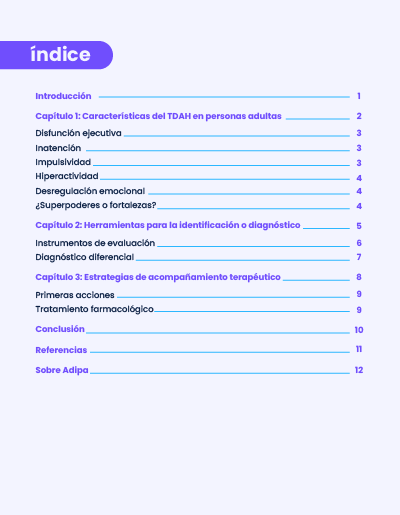 Este ebook, titulado “TDAH en adultos: Una guía de conocimientos clave”, está diseñado para ser un recurso valioso y práctico para profesionales de la salud mental que trabajan con población adulta. Su contenido está estructurado en tres capítulos principales que exploran: