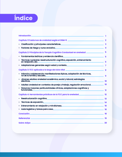La terapia cognitivo conductual es uno de los enfoques más eficaces para tratar la ansiedad en cualquier etapa de la vida. Este ebook reúne fundamentos, técnicas clave y aplicaciones prácticas adaptadas al ciclo vital, convirtiéndose en un recurso esencial para profesionales de la salud mental. Descarga gratis el ebook completo aquí.