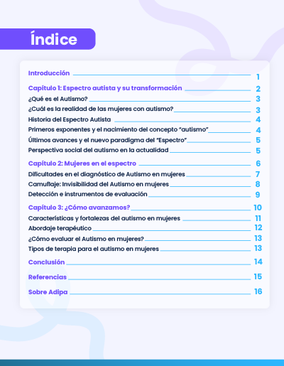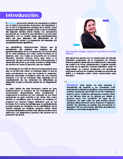 📌 Bienvenidos al Ebook de Autismo en mujeres: Diagnóstico tardío y consecuencias que busca ofrecer información actualizada, desde una perspectiva profesional y clínica, sobre el abordaje del autismo en mujeres o también catalogado como Trastorno del Espectro Autista (TEA) por el DSM-V como por la CIE-11.
