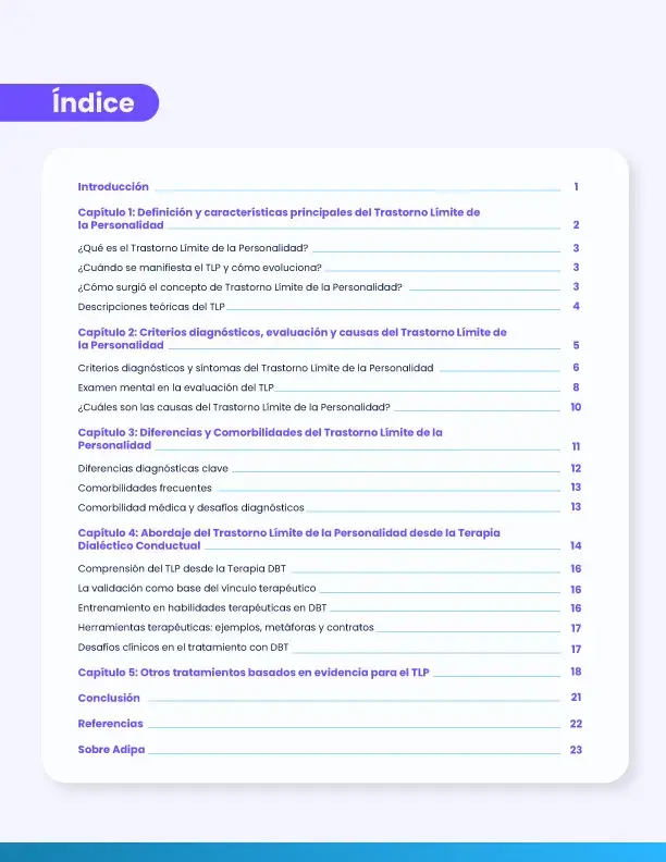 En este ebook, elaborado junto al PhD. Mg. Ps. Nicolás Labbé, exploramos cómo evaluar y tratar el TLP desde una mirada empática, actualizada y basada en evidencia. Recorre los criterios diagnósticos, las claves diferenciales, las comorbilidades más frecuentes y las bases clínicas de la Terapia Dialéctico Conductual, uno de los enfoques más eficaces en el trabajo con estos pacientes.