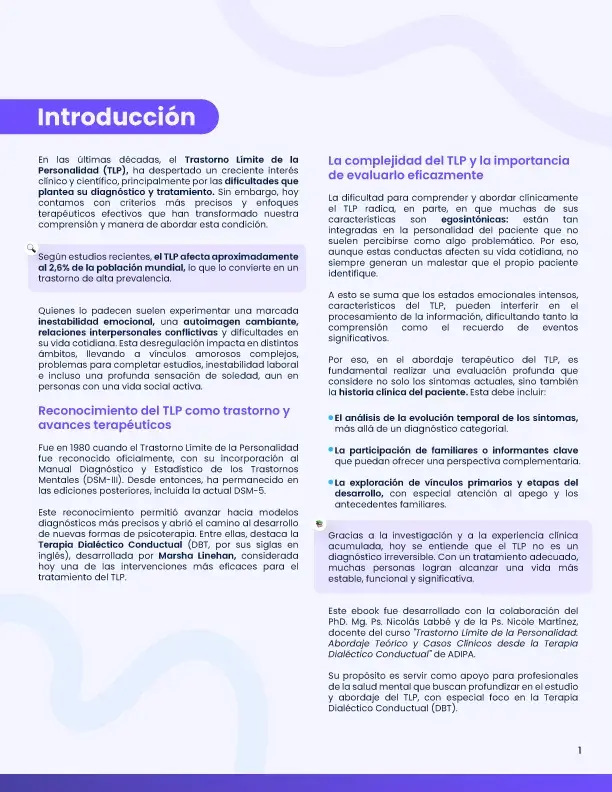 Este ebook, elaborado junto al PhD. Mg. Ps. Nicolás Labbé, ofrece una guía clara y actualizada para comprender el TLP en profundidad y abordarlo terapéuticamente desde la Terapia Dialéctico Conductual (DBT), uno de los enfoques más eficaces en su tratamiento.